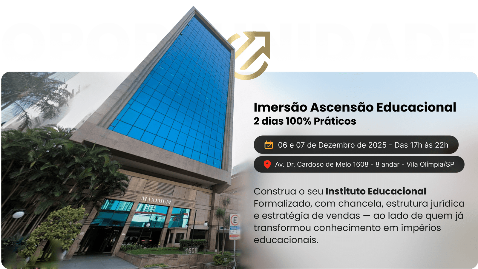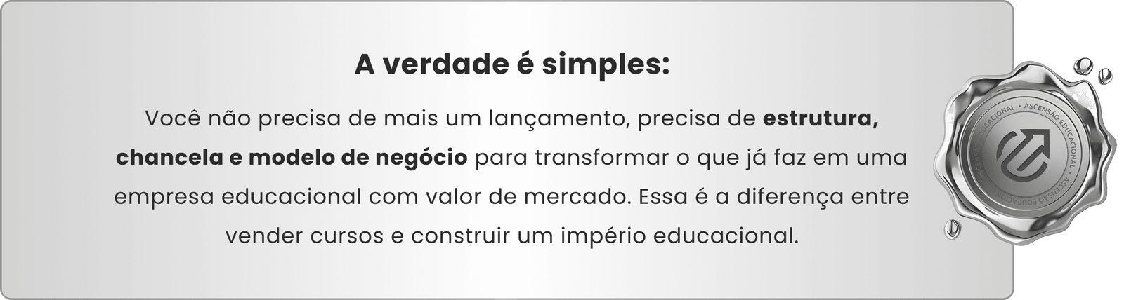 Você não precisa de mais um lançamento, precisa de estrutura, chancela e modelo de negócio para transformar o que já faz em uma empresa educacional com valor de mercado. Essa é a diferença entre vender cursos e construir um império educacional.